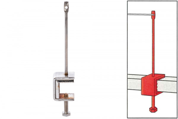 Draadstang van 95mm gelast op een klem die op een stalen balk kan worden geklemd. Geheel in RVS uitgevoerd.