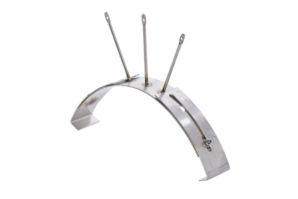 Drie draadstangen van 95mm gelast op een beugel. Geheel in RVS uitgevoerd en te klemmen op de nok van een pannendak.
